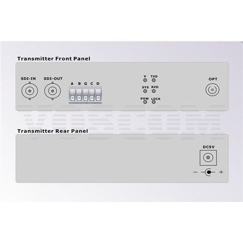 3G-SDI Fibre Extender VOS-1H3G-DT/R provides for the digital transmission of 1-Channel uncompressed 2.97Gbps 3G-SDI (SMPTE 424M), 1.485 Gbps HD-SDI (SMPTE 292) or 270 Mbps SD-SDI (SMPTE 259M) 1080P HD video over fibre, support 1 duplex RS232/RS485 seria data, also support one loopback output for local display, and dual outputs for two displays in the remote end. Stand-alone or rack-mount. All 3G-SDI Fibre Exnteder of VOS-1H3G-DT/R come in an insert card version. The cards can be inserted into our 16-slot, 19inch 4U rack-mountable card cage (VOS-CH04-HD16). Single-Mode or Multi-Mode, VOS-1H3G-DT/R can support FC/PC or ST/PC optical connector, the transmission distance range according to the Optical Budget. Manufacturer's standard is: Single-mode 20km, Multi-mode 300m.