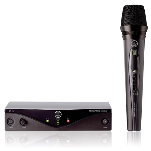 The AKG PW45-Vocal Perception wireless microphone system is a premium wireless audio solution for on stage and live vocal applications. Delivering brilliant sound, with a simple and very easy to use design. It is the optimum plug and play wireless solution for small stages, clubs, places of worship, hotels, and gyms. The preset frequency sets allow easy setup from single-channel applications to multichannel systems.