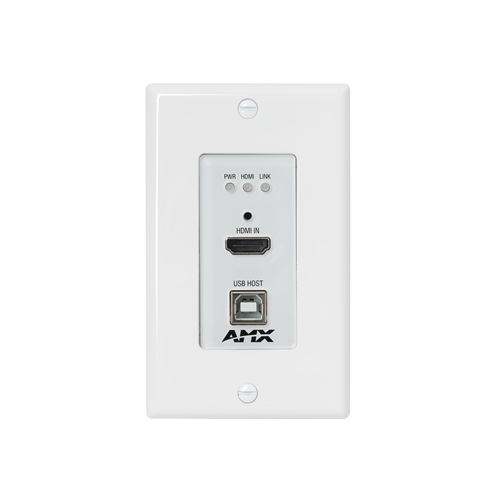 The AMX DXLink 4K60 HDMI Wallplate Transmitter is a 4K60 4:4:4 capable distance transport solution with support for HDMI 2.0 and HDCP 2.2. It transmits audio, video, and USB 2.0 over one shielded Cat6A or Cat7 standard twisted pair cable. DXLink 4K60 HDMI Wallplate Transmitters are perfect for sending HDMI and control signals over long distances to remote DXLink 4K60 Receiver Modules or other compatible AMX Receivers such as the DGX DXLink 4K60 Twisted Pair Input Board or DVX 4K60 All-In-One Presentation Switchers. The transmitter's built-in USB Host port can be connected to a laptop to provide access to USB devices such as a room cameras or soundbars, connected to a DXLink receiver near a display.