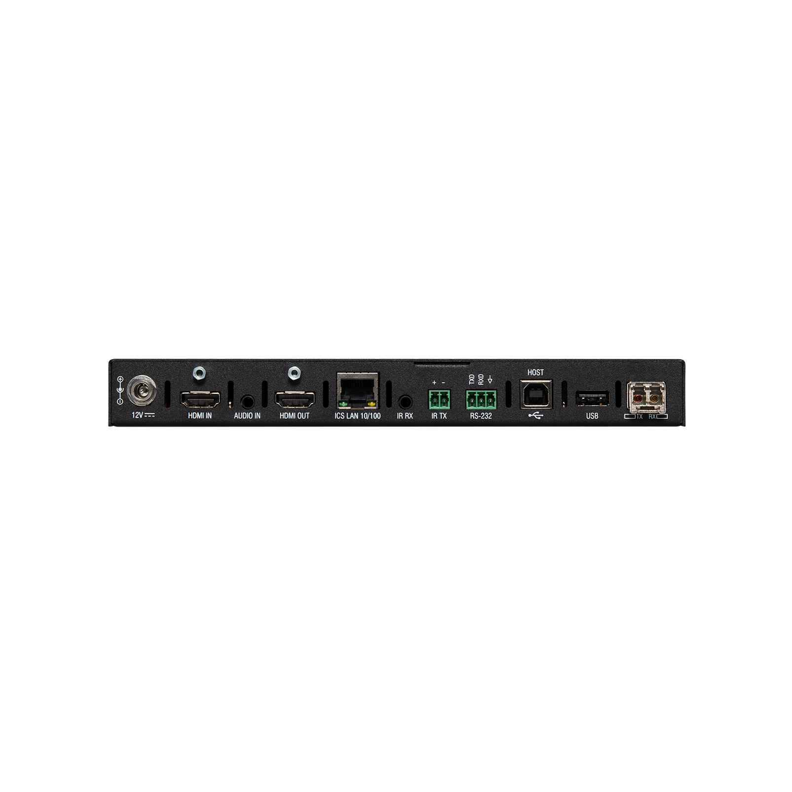 This module transmits audio, video, control, USB 2.0, and Ethernet over duplex fiber up to 300 meters to a DXLink 4K60 Fiber receiver. It includes a Multi-Mode Duplex (MMD) SFP, which can be replaced with a Single-Mode Duplex (SMD) SFP if needed.