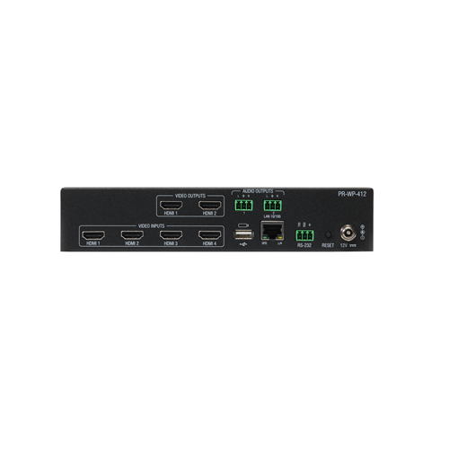 The PR-WP-412 is ideal for a variety of applications, including corporate campuses, colleges and universities, sports bars, casinos, courtrooms and other government applications as a cost-effective solution to switch or combine 4K60 4:4:4 HDMI sources on a single display.