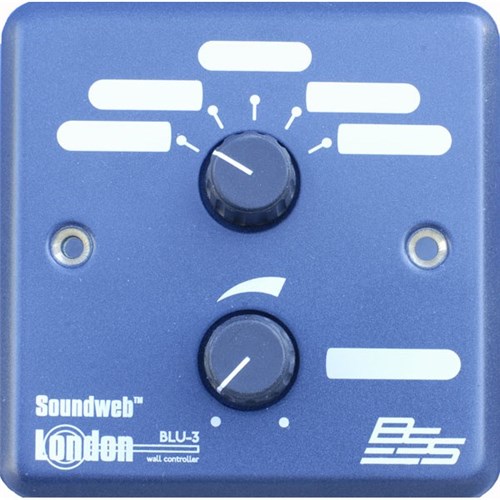 The BLU-3 wall panel is a simple controller which allows the designer to provide level control and source selection or preset recall in a simple wall-mounted panel.These controllers connect to the control ports on the rear of any Soundweb London BLU Series processor.The BLU-3 offers a rotary fader and a five-way switch. The switch could select system presets (configurations specific to times of the day for example) while the rotary control could be assigned to act as a zone volume control. The switches on both units have blank areas for marking the switch functions, either directly onto the white area, or on self-adhesive labels.