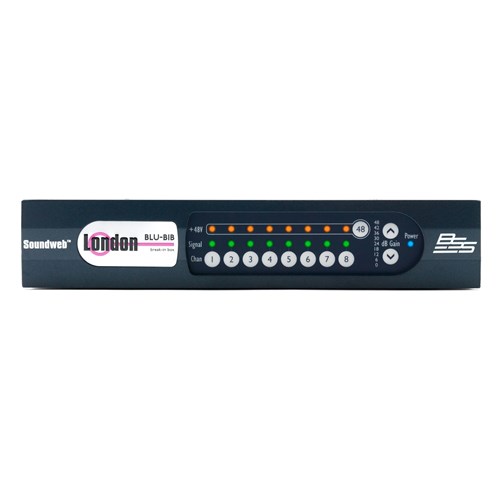 The Soundweb London BLU-BIB or break-in box offers 8 channels of analog audio input expansion via the Soundweb London high bandwidth, fault tolerant digital audio bus. This expander features a low latency, fault tolerant digital audio bus of 256 channels which uses standard Category 5e cabling giving a distance of 100m between compatible devices. The BSS Audio MC-1 fiber optic media converter can be used to increase the distance between devices to over 10km (6.2 miles) using single mode fiber. The BLU-BIB input channels are easily configured by six DIP switches located on the rear of the device, which select consecutive channels in groups of eight. This simple configuration allows assignment to any 8-channel range within the 256 channels available on the digital audio bus. Input channel assignments are configured by DIP switch selection only. The BLU-BIB is not configured by HiQnet™ London Architect. Each channel s input gain and Phantom Power are adjusted using buttons on the front panel. The 8 analog mic/line level inputs utilize the same terminal block connectors as the other members of the Soundweb London family. Signal present, clip, and Phantom Power per channel are displayed by front panel LED indicators. The front panel also contains a power status and applied gain LED indicators. The BLU-BIB operates in three different modes, which are entered and exited via the front panel controls. Edit Mode allows the user to adjust each channel s input gain and Phantom Power. Normal Mode prevents the user from changing input gain or Phantom Power. Stealth Mode prevents the same changes from occurring, but without LED illumination (except power). The chassis is a half rack wide and can be rack mounted using the BSS Audio 1U Rack-Mount Kit. It can also be under-table mounted or wall mounted using the included mounting brackets. The BLU-BIB break-in box input expander is powered by a 12V DC adapter which is included with the device. The BLU-BIB and the other members of the Soundweb London family provide the building blocks of the perfectly tailored system solution.