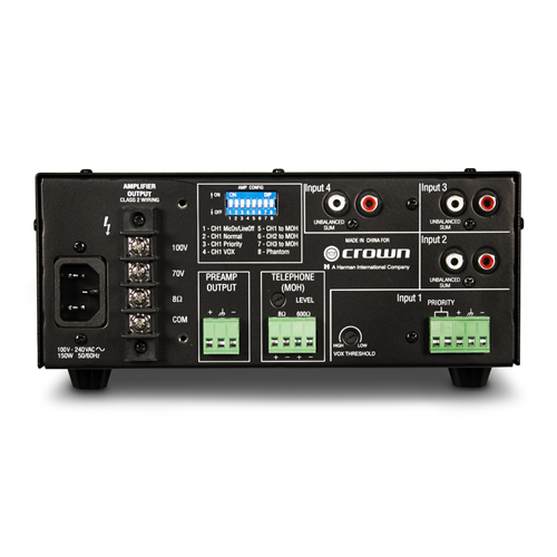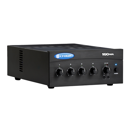 Crown's 135MA and 160MA are high value mixer-amplifiers for commercial audio. They provide 8-ohm and constant-voltage outputs (70V and 100V). Typical uses are paging, background music, and music-on-hold. The 135MA provides 3 inputs (each with a volume control) and a 35W amplifier output. The 160MA provides 4 inputs (each with a volume control) and a 60W amplifier output. Other features include priority muting, voice activated muting, phantom power, and bass and treble controls.