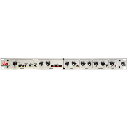 The dbx® 286s is a full featured Channel Strip Processor that delivers a studio quality microphone/instrument preamplifier and four processors that can be used independently or in any combination. Why mic up vocals and instruments through a noisy, blurry mixer? The sonically pristine dbx 286s Mic Preamp has all the features you need, including wide-ranging input gain control, switchable +48V phantom power, and an 80Hz high-pass filter to remove low frequency hum, rumble or wind. Use the patented dbx OverEasy® compressor to transparently smooth out uneven acoustic tracks or deliver that classic "in your face" vocal performance that only a dbx compressor can. Eliminate vocal sibilance and high frequency distortion from instruments such as cymbals with the frequency tunable De-Esser. Fine-tune the Enhancer HF Detail control to add sparkle and crispness to your tracks and make adjustments to the LF Detail control to add fullness and depth to vocals and bass instruments while cleaning up the muddy low midrange frequencies. And, the separate threshold and ratio controls on the Expander/Gate allow you to subtly reduce headphone leakage or radically gate noisy guitar amps.