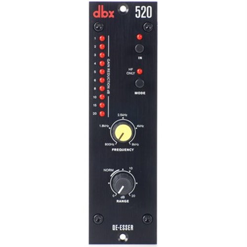 With its modular 500 Series based design, the dbx 520 examines the differences in dB between the high frequency and full-bandwidth portions of a signal, allowing de-essing of signals which change in level by as much as 60dB. It features a Frequency Control with range from 800Hz to 8kHz, Gain Reduction Metering and a De-essing Amount Range from 0dB to 20dB.