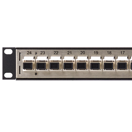 Panel Features: • Keystone jacks mount flush with the surface of the panel• Accommodates high-density (HD) keystone inserts with up to a 17 mm width• Folded steel front panel with a durable black powder-coat finish• Nickel-plated rear panel and two 45-degree faston lugs enable bussed and bonded grounding schemes when used with shielded modular jacks• Silk screened circuit numbering on the rear• 1 x DS430-10 designation strip on the front (bar and cap design)• 6" (15.24 cm) deep removable rear lacing bar for cable dressing
