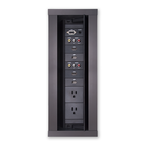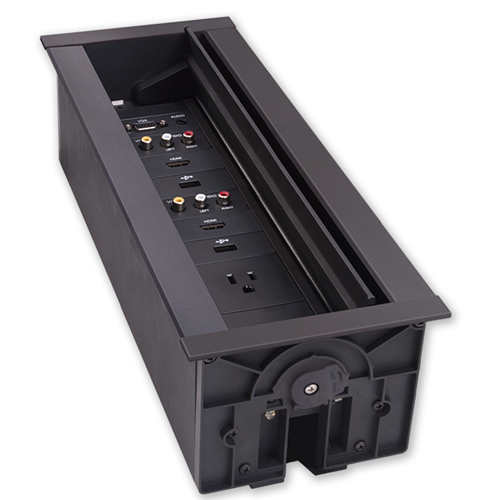 The HPX-1200 / HydraPort® 12 Module Connection Port is a modular AV table box for connecting mobile devices to projectors or displays in a conference room or classroom. This sleek, flush-mount table box is typically installed in a conference room or classroom table, featuring a uniquely-designed lid that conveniently opens in both directions to provide a clean, unobtrusive look.