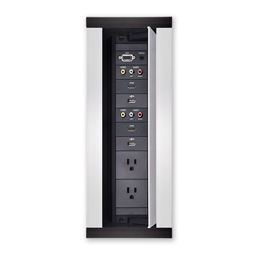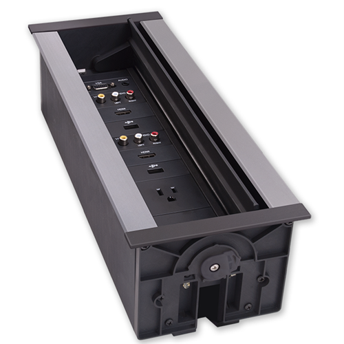 The HPX-1200 / HydraPort® 12 Module Connection Port is a modular AV table box for connecting mobile devices to projectors or displays in a conference room or classroom. This sleek, flush-mount table box is typically installed in a conference room or classroom table, featuring a uniquely-designed lid that conveniently opens in both directions to provide a clean, unobtrusive look.