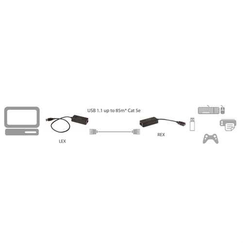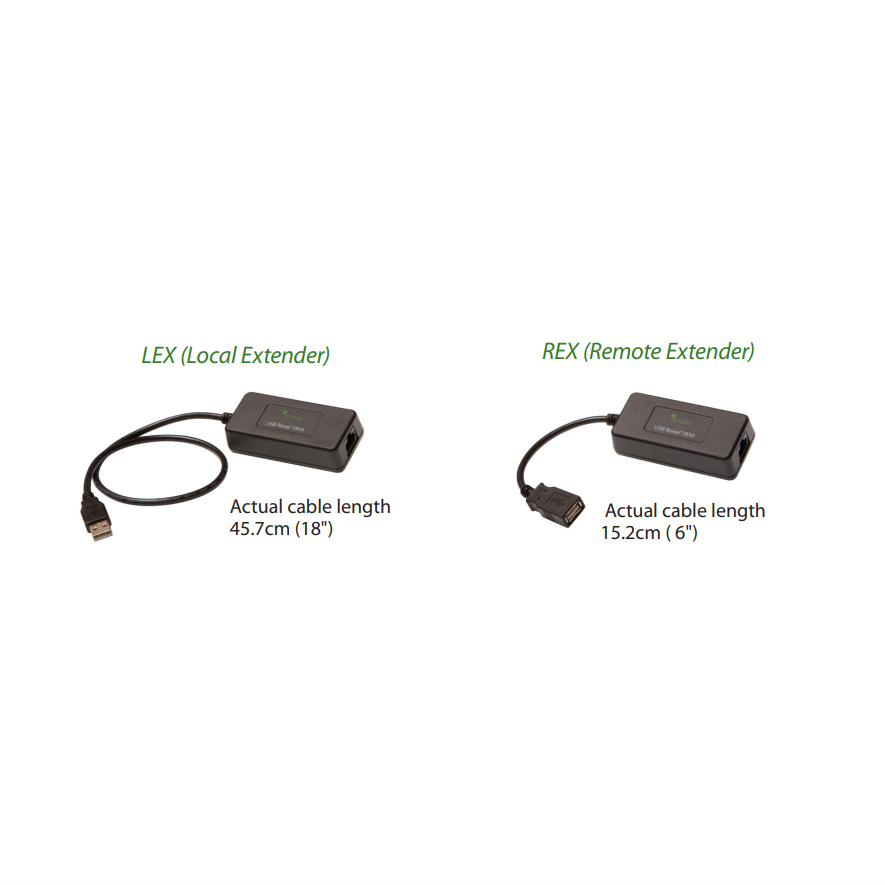 The USB Rover 1850 product is composed of two separate units: the Local Extender (LEX) and the Remote Extender (REX). Conventional USB cables are used to connect the LEX unit to the host computer, and the remote USB device to the REX unit. Cat 5e UTP cabling is used to connect the LEX and REX units over a distance of up to 85m (279 ft).
