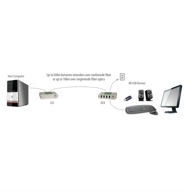 Additionally, this ExtremeUSB based USB 2.0 multimode fibre extender system is FCC/CE Class B certified and ideal for use with all USB peripherals including: keyboards, mice, interactive white boards, flash drives, hard drives, audio devices, web cameras and any other USB 2.0 or 1.1 device.