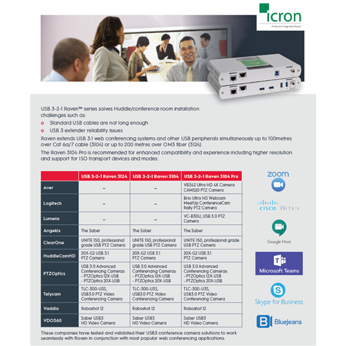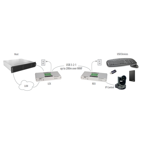 Icron’s USB 3-2-1 Raven 3124 extender system is backward compatible to USB 2.0/1.1 and provide the ability to connect all USB 3.1 Gen 1 (5 Gbps) device types to a host across a point-to-point connection up to 200m over multi-mode fibre. The Raven provides an Ethernet pass-through for connecting to network enabled devices or to use existing infrastructure without losing LAN connectivity, and includes the ExtremeUSB-C™ suite of features: transparent USB extension, true plug and play (no software drivers required) and compatibility with all major operating systems.