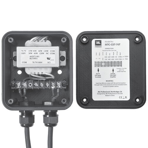 MTC-CBT-70T is a bolt-on transformer module to adapt CBT 70J-1 and CBT 70JE-1 (and CBT 70J-1/JE-1 arrays) for use on distributed loudspeaker lines. It allows long cable runs and multiple speakers to be driven from a single distributed system amplifier channel.