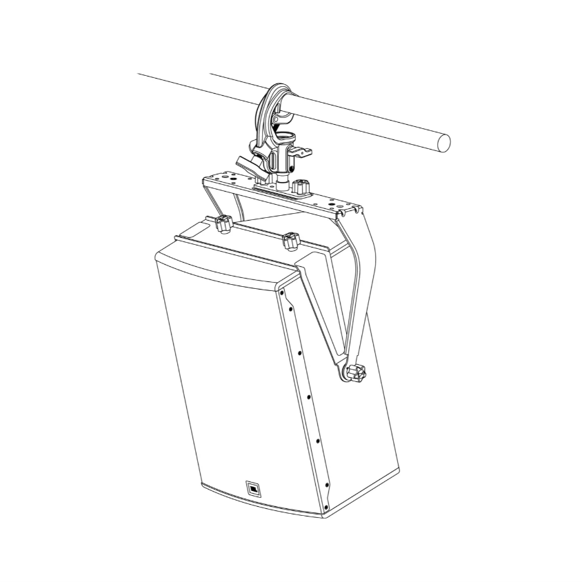 The SRX915M UBV is a versatile U-bracket accessory designed for vertically mounting SRX915M loudspeakers. The two-piece design attaches to the enclosure using the included M10 knobs and the two top or bottom M10 QuickLink™ attachment points on the speaker, depending on the desired orientation. Two additional M10 knobs are used to lock the bracket at the desired tilt angle. Several M12 through-holes are provided for use with standard pipe or truss clamp adapters. The bracket is also compatible with the JBL RC100 rotating clamp which allows for a full 360 degree horizontal rotation when combined with the TV SPIGOT T accessory. Two M10 attachment points are available for installing eye bolts when suspending SRX915M loudspeakers with wire. The SRX915M UBV can also be used for pole mounting when combined with the optional Pole Mount Adapter. This combination allows for a greater down angle than is otherwise possible using the pole cup on the speaker.