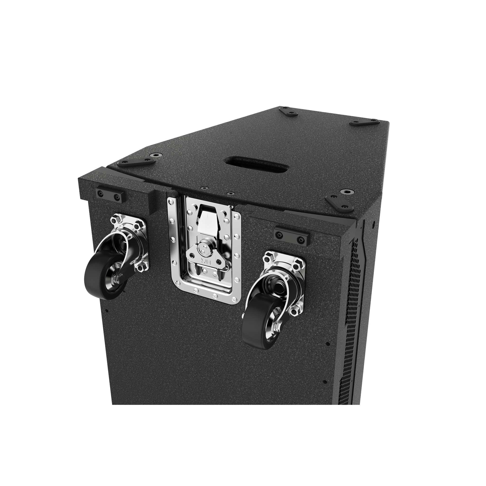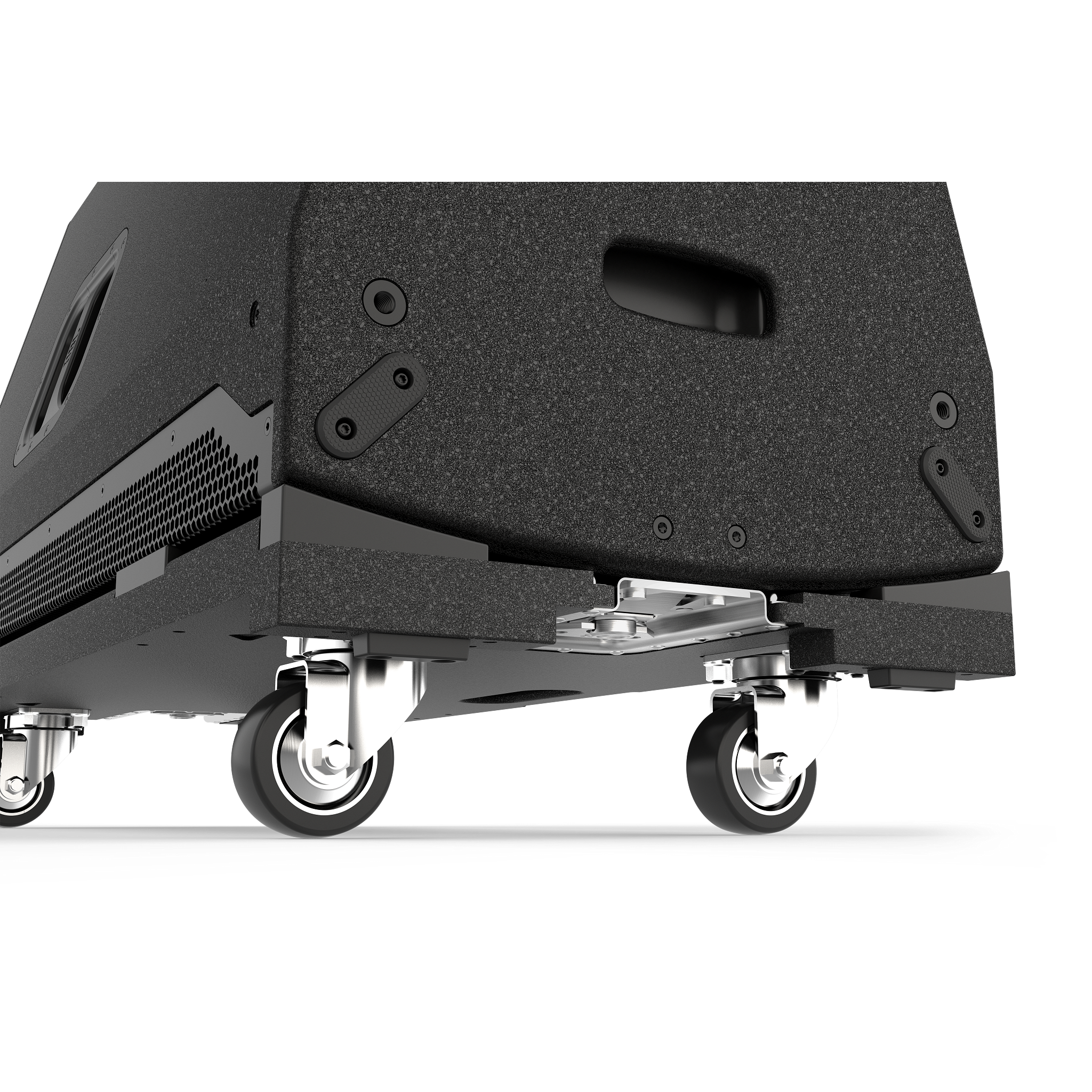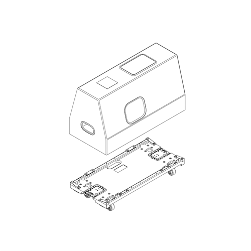 The SRX922 ACC is an accessory kit designed for the transport and protection of a single SRX922 enclosure. The kit includes a padded, reinforced protective cover with handle cutouts and a rear access flap, as well as a dolly caster board equipped with rugged, tour-grade casters and latching mechanisms for secure attachment to the SRX922 enclosure. The caster board features a stackable design for efficient storage when not in use. For applications where transporting multiple cabinets is preferred, a Vertical Transporter (SRX922 VT) is also available for transporting two SRX922 enclosures together.