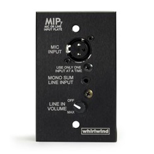 The MIP7 permits the connection of a microphone or line source to a single mic input of a remote audio processor. The mic input XLR is connected directly to the output screw terminal plug. Set the audio processor channel gain for the desired system level of the MIP7 mic output. A stereo line source can be connected to the 3.5mm TRS jack. Left and right are automatically summed to mono and applied to the line input volume control. This pot allows adjustment of the line input to avoid overdriving the mic preamp in the remote processor. Condenser mics can receive phantom power from the processor. Use only one input of the MIP7 at a time. Do not use the mic and line inputs simultaneously.