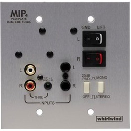 MIP1This product accepts stereo RCA, 3.5mm TRS inputs (summed to mono) or a low Wattage power amplifier output i.e. projector’s speaker out. A 16 Ohm 5 Watt load resistor is provided. The signal is converted with a Whirlwind DImax transformer to Low-Z mic level and is output via rear mounted screw terminals. A ground lift is provided to break the ground connection from the line in to the output. Additionally a female XLR is provided with rear screw terminals.MIP2This product accepts stereo RCA and 3.5mm TRS inputs (summed to mono), The signal is converted with a Whirlwind DImax transformer toLow-Z mic level and is output via screw terminals. A 20 dB pad is provided to attenuate hot inputs and a ground lift is provided to break the ground connection from the input to the output.MIP4This product (A wall plate version of our popular pcDI) is perfect for interfacing the outputs of CD players, computer sound cards, iPODs® / MP3 players, tape decks, etc. with professional, balanced, low impedance equipment. This unit contains two separate DIs - input your signals with one 3.5mm (1/8") mini TRS stereo jack, color coded RCA phono jacks or 1/4" TS input jacks. The RCA and 3.5 mm jacks are wired in parallel if a through connection is required. Outputs are on the rear via 3.5 mm screw type removable plugs (Phoenix 1984329 or equivalent). The Mip4 has a Ground Lift switch to help eliminate hum and buzz, a Stereo/Mono switch for stereo operation or safely combine both inputs into a mono signal sent to both outputs, and a 20dB pad switch for connection to "hot" input signals.