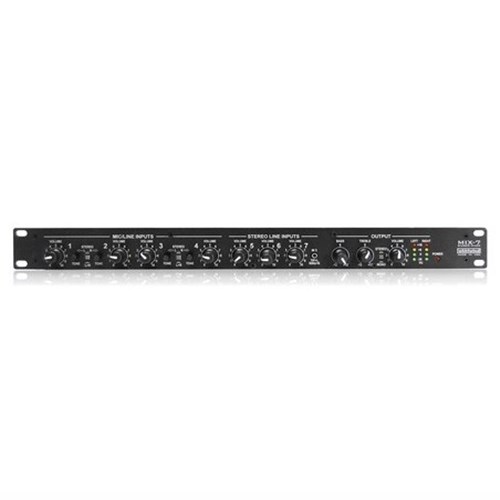 MIX-7 Contractor Mixer The Whirlwind Mix-7 is a versatile stereo mixer, combining four mono mic/line inputs and three stereo line inputs, in a compact, easy to use one rack space package. The Mix-7 provides up to 76 dB of gain, professional quality signal to noise ratio and full frequency response. Designed for use anywhere microphone and music sources need to be combined, the Mix-7 is ideal for use in broadcast production, sports facilities and banquet rooms. Features include stereo/mono switching, a tone control on each of the mic/line inputs, two place master EQ, metreing and a stereo/mono switch on the main outputs.