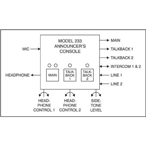 The Model 230 Announcer's Console is designed to serve as the audio control "hub" for announcers, commentators, and production personnel. The tabletop unit is suited for numerous applications including on-air television and radio broadcasting. The Model 230 is compatible with essentially all broadcast and production audio system environments. Standard connectors are used to interface microphone, headphone, on-air, talkback, IFB, and party-line intercom signals.
