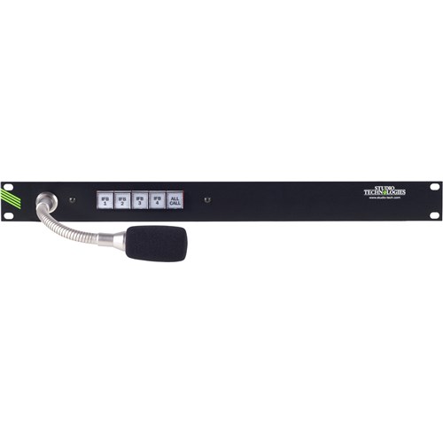 The Model 24 consists of a metal chassis containing five lighted pushbutton switches, microphone and line inputs, and supporting audio, status, and control circuitry. An external interrupt audio source is required. This can be in the form of a microphone or line-level signal. A microphone input is provided for connection to an electret gooseneck microphone. The Model 11A Gooseneck Microphone, an option available from Studio Technologies, is directly compatible. The transformer-coupled line input allows various pieces of communications equipment to serve as the interrupt audio source. This can be used to interface with intercom systems from companies such as RTS® and Clear-Com®, typically utilizing their "hot mic out" signals. A configuration switch allows Model 24 interrupt activity to mute the monitor amplifier outputs on the associated Model 2A Central Controllers.