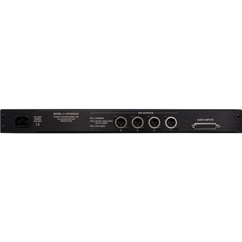 Installation of the Model 41 is very simple. Audio input connections are made using a 25-pin D-subminiature connector. The IFB output circuits interface using standard 3-pin XLR connectors. The compact, one-rack-space package is constructed using rugged steel and aluminum components. The unit's AC mains power input can range from 100 to 240 V, 50/60 hertz. This "universal input" ensures correct operation virtually anywhere in the world.