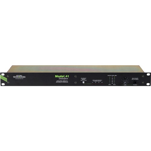 In many cases, the Model 41 Interface will be used in on-air television applications. Whether installed in a fixed location or as part of a mobile facility, the unit is capable of providing excellent performance. In addition, the Model 41 can be used for non-broadcast applications. For example, audio recording and post-production facilities can also effectively use the Model 41. Combined with stereo or mono listen-only beltpacks, also available from Studio Technologies, a variety of headphone cue systems can easily be deployed. And since the Model 41's audio inputs are compatible with standard line-level audio signals virtually any analog source can be connected.