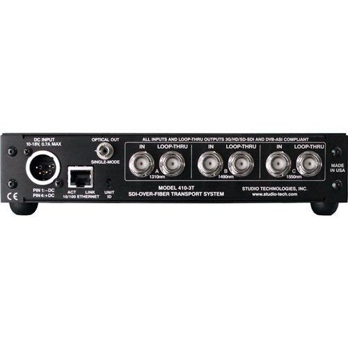 The Model 410 uses a novel hardware implementation to transport three SDI signals over one single-mode optical fibre. The three SDI signals, at rates of up to 2.97 Gb/s, are transported over one fibre at wavelengths of 1310, 1490, and 1550 nm. In typical applications the launch power is such that signals can be transported over a minimum distance of 10 kilometres.