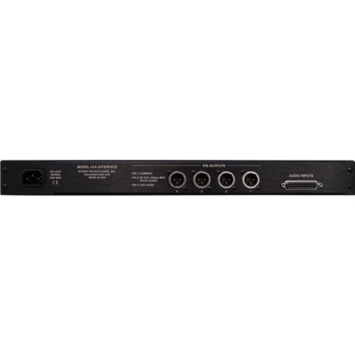 Installation of the Model 42A is very simple. Audio input connections are made using a 25-pin D-subminiature connector. The IFB output circuits interface using standard 3-pin XLR connectors. The compact, one-rack-space package is constructed using rugged steel and aluminum components. The unit's AC mains power input can range from 100 to 240 V, 50/60 hertz. This "universal input" ensures correct operation virtually anywhere in the world.