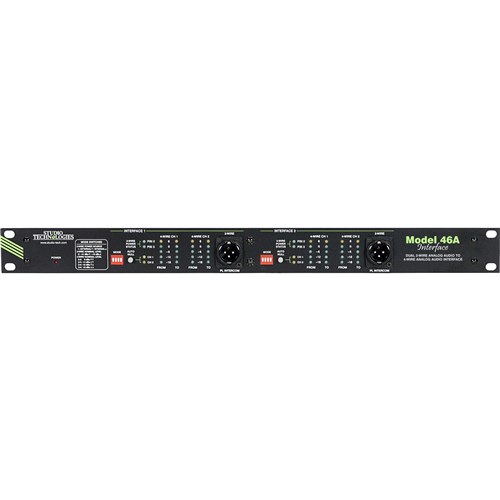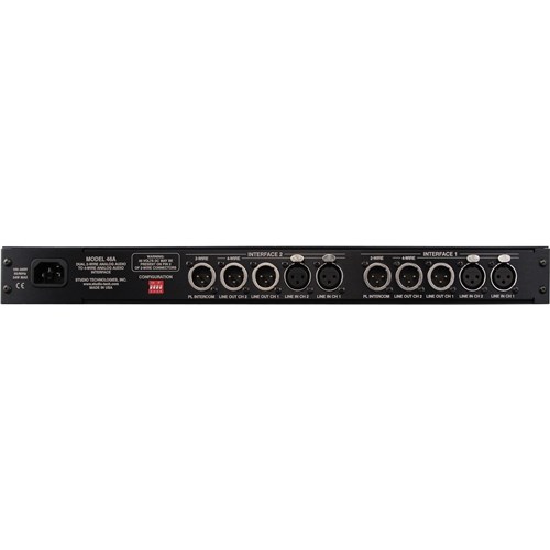 The Model 46A's 2-wire interfaces are optimised for direct connection with 2-channel party-line intercom circuits. In addition, single-channel party-line intercom circuits can also be connected. Many broadcast applications use the 2-channel TW-Series from RTS®, including their popular BP325 beltpack. Other industry-standard single- and 2-channel PL intercom systems, including those from Clear-Com®, are also directly compatible. To provide optimal signal matching and interface performance the nominal level of the Model 46A's 2-wire interfaces can be selected. Using DIP switches, accessible on the front panel, the nominal levels can be selected to be either –10 or –14 dBu, settings that should allow compatibility with virtually all party-line systems. For example, for applications that use equipment from RTS the –10 dBu setting is appropriate. For other equipment, such as that from Clear-Com, the –14 setting is correct.
