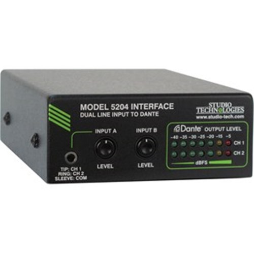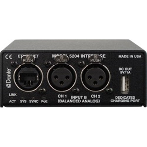 The Model 5204 Interface is a general-purpose audio device that supports applications utilizing the Dante™ Audio-over-Ethernet media networking technology. Two 2-channel ("stereo") analog line-level audio signals can be connected to the Model 5204 and then converted to two channels on an associated Dante connection.