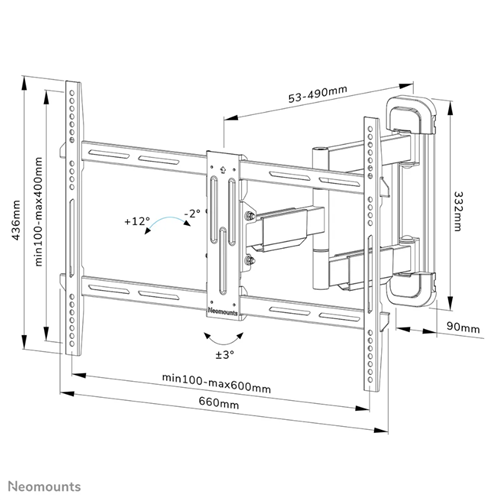The Neomounts by Newstar WL40-550BL16 is a full motion wall mount for flat screens up to 65" with a maximum weight capacity of 40 kg. The versatile tilt (14°) and swivel (40°) technology allows you to create the optimum viewing angle. The mount can be levelled for the perfect installation.The WL40-550BL16 has a depth of 5,3-49 cm and is suitable for screens that meet VESA hole pattern 100x100 to 600x400 mm.The mount features a nifty Easy-release system, that allows you to attach the TV in a wink of an eye. The mount is equipped with cable management, to secure any loose cables on the back of the screen.