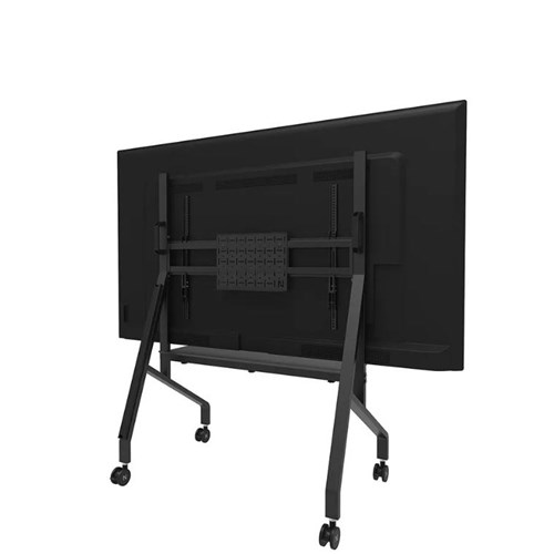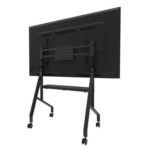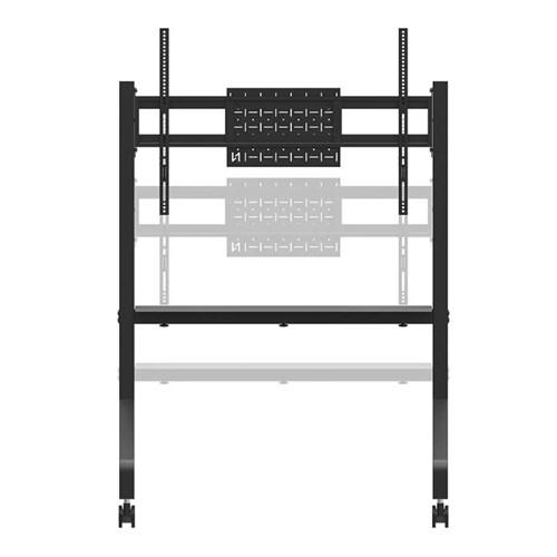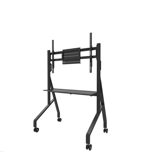 The Neomounts FL50-525BL1 MOVE Go is a mobile floor stand for flat screens up to 86" with a maximum weight capacity of 76 kg. Due to the sturdy design and the included touch screen stabilizers, the MOVE Go is a perfect solution for touch screens. The floor stand is manually adjustable in 4 preset height positions, ranging from 106 to 136 cm.The Neomounts MOVE Go is packed partially pre-assembled and installation can be done within just minutes. The trolley features practical handles and four solid 7,5 cm double locking caster wheels that allow you to move and use the floor stand wherever you like. Due to the large caster wheels, thresholds or carpets are no challenge to the FL50-525BL1. A multimedia shelf (front and back mountable) with a maximum weight capacity of 10 kg and an AV hardware rack is included and optional for installation. The screen on the trolley can be secured by locking the brackets using a padlock (not included).