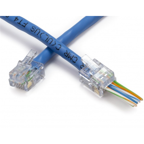 The EZ-RJ12/11 Connector simplifies twisted pair terminations by allowing the wires to be inserted through the connector and out the front. This allows the technician to easily verify the proper wiring order prior to termination. Use the EZ-RJPRO HD™ Crimp Tool (P/N 100054) or EXO Crimp Frame® with EZ-12/11 Die (100061 & 100073C) for single cycle crimping and trimming of the excess wire.