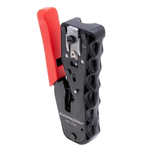 The PTS (Pass Through Standard) Pro Crimp Tool takes years of Platinum Tools innovations and combines multiple tools into one sleek design. The PTS Pro allows the termination of both ezEX-RJ45 Connectors and the legacy EZ-RJ45 connectors in a single tool with no part changes. The tool utilizes a sliding plate to change between the different types of connectors and a captive thumb screw to make swapping between connector styles seamless. The tool features a connector locking mechanism so connectors “click” into the tool for termination. This tool also includes the cutting and stripping blades for Cat5e and 6 built directly into the handle. A single tool for all the Platinum Tools terminations.