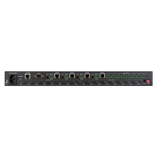 The AMX Precis 8x8 Matrix Switcher is a cost effective 4K60 4:4:4 fixed matrix switching solution which features 8 HDMI inputs and outputs. 4 of the outputs also feature mirrored HDBaseT outputs as well, providing connection directly to a display or projector that supports standard HDBaseT or for use with the AMX PR01-RX HDBaseT Receiver and Scaler. The addition of built-in HDBaseT mirrored outputs provides a cost-effective solution for distributing video over longer distances without degrading video quality.
