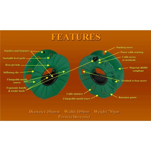 The Cordwheel and Pack Reel are both used for reeling cables in outside broadcast and event management. They are both corrosive resistant and UV protected. The Pack Reel has no metallic components and the Cordwheel handle and winder knob are attached by stainless steel screws. Both reels are impact resistant, rugged and lightweight. They can assist with managing expensive cables which can be damaged during use. The Cordwheel and Pack Reel therefore assist in cost reduction by deploying and storing cables in a safe and efficient manner.