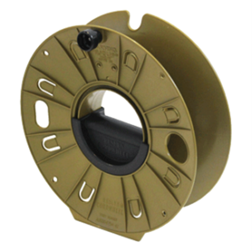 Olive green spool with black centre handle and winder knob.
