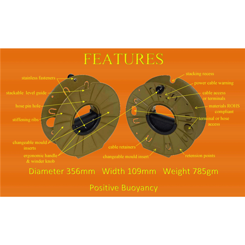 The Cordwheel and Pack Reel are both used for reeling cables in outside broadcast and event management. They are both corrosive resistant and UV protected. The Pack Reel has no metallic components and the Cordwheel handle and winder knob are attached by stainless steel screws. Both reels are impact resistant, rugged and lightweight. They can assist with managing expensive cables which can be damaged during use. The Cordwheel and Pack Reel therefore assist in cost reduction by deploying and storing cables in a safe and efficient manner.