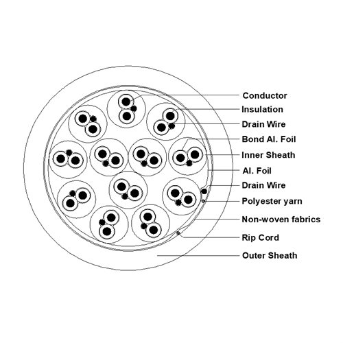 (7/0.203TC x 1P + Foam PE Insulation + Drain Wire + Bonded Al. Foil + PVC Inner Sheath) x 12C + Al. Foil + Drain Wire + Polyester yarn + Non-woven fabrics + Rip Cord + PVC Outer Sheath O.D 21.6mm