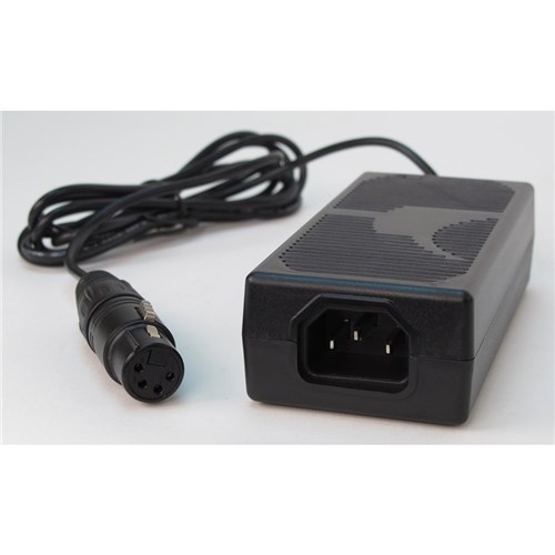 Universal input, 100-240 volts, 50/60 Hz; 12 volts DC, 5 amps (60 watts) output power supply. IEC C14 mains inlet; cable-mounted 4-pin female XLR DC output. Used for powering Live-Link Remote Camera Interface Systems and Model 5100-Series Broadcast Support Modules. External tabletop unit features worldwide approvals and output status LED indicator.