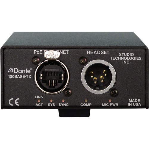 The Model 371A includes a range of new capabilities, along with the advanced performance and flexibility that Dante® audio-over-Ethernet provides. Over a standard IP network, multiple Model 371A units can be used in party-line (PL) intercom applications with help from an external Dante-enabled audio matrix such as the Studio Technologies Model 5422 Dante Intercom Audio Engine. Alternately, units can be used "point-to-point" or interfaced with Dante-compatible matrix intercom systems.