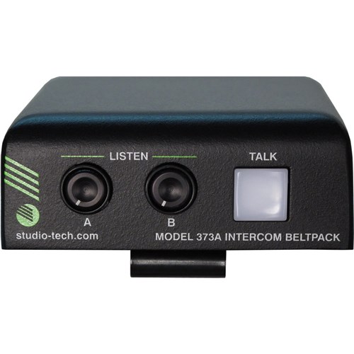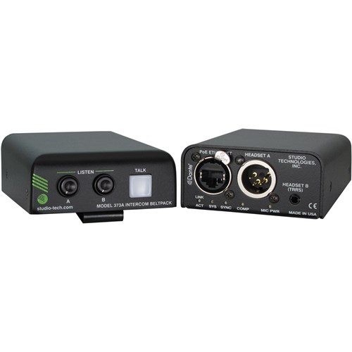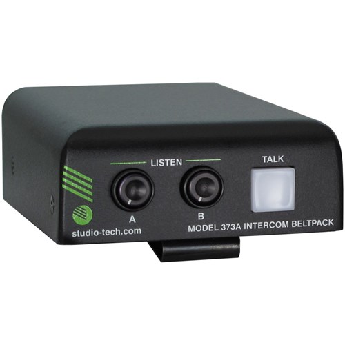 The Model 373A Intercom Beltpack is a highly compact user-worn device that combines a single channel of talk and two channels of listen. The unit begins with the features offered by traditional analog party-line (PL) intercom user devices and adds a range of new capabilities, along with the advanced performance and flexibility that Dante® audio-over-Ethernet provides. Over a standard IP network, multiple Model 373A and other compatible Studio Technologies' beltpack units can be used to create party-line intercom applications with help from an external Dante-enabled audio matrix such as the Studio Technologies' Model 5422 Dante Intercom Audio Engine. Alternately, Model 373A units can be used "point-to-point" or interfaced with Dante-compatible matrix intercom systems.