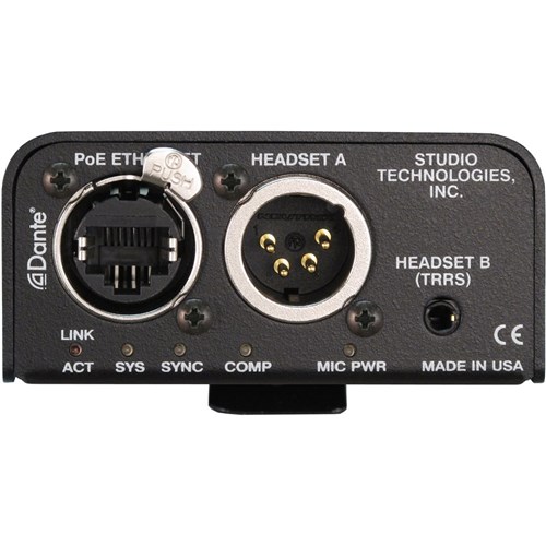 Only a single Power-over-Ethernet (PoE) connection is required for operation. Key user features can be easily configured using the STcontroller software application. Configurable parameters include electret microphone powering, microphone preamplifier gain, talk button operation, and headphone channel assignment. Features include integrated sidetone, call signal receive display, and remote mic kill ("talk off"). The range of capabilities, along with the excellent audio quality provided by the digital audio signal path, offers a unique and powerful user experience.