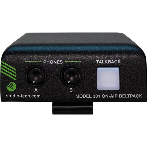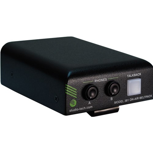 The Model 381 On-Air Beltpack offers a unique combination of audio resources to directly support a complete broadcast "stand-up" on-air position. Using Dante® audio-over-Ethernet technology, the unit provides main and talkback output channels, talent cue (IFB) input, and sidetone capabilities, as well as essential user controls in a compact, portable package. The Model 381 is compatible with the Dante Domain Manager™ (DDM) software application and is AES67-compliant for direct integration into many contemporary networked audio applications.