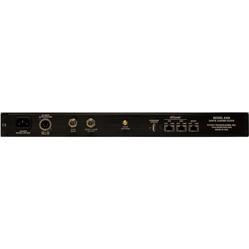 Applications for the Model 5402 include broadcast and post-production facilities, college and university audio networks, arenas, stadiums, and corporate installations — virtually any application where substantial numbers of Dante-compatible devices are utilized. The Model 5402 will serve as a stable and consistent Leader clock for the entire Dante "network." And, as expected, the Model 5402 is compatible with all Dante devices, no matter what their primary function or manufacturer. Applications that utilize devices compatible with AES67 will also benefit from the Model 5402's resources. With its ability to "lock" to satellite-based time standards, multiple Model 5402 units can be deployed literally "around the world" and maintain synchronized PTP performance.