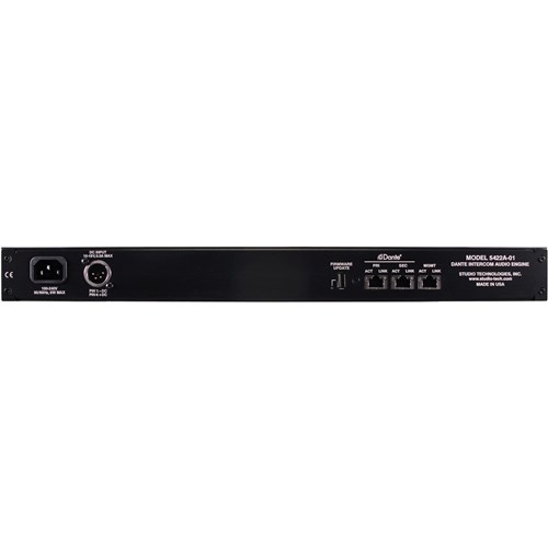 The Model 5422A Dante Intercom Audio Engine is a high-performance, cost-effective, and flexible solution for creating party-line (PL) intercom circuits when used with Dante-compatible products. These include the Studio Technologies range of 1-, 2- and 4-channel intercom beltpacks. The Model 5422A will also prove valuable in a variety of other general audio and broadcast-related mixing, IFB (talent cueing), and interfacing applications. The unit is suitable for use in fixed and mobile broadcast facilities, post-production studios, commercial and educational theater environments, and entertainment applications. Only power and Ethernet network connections are required for the Model 5422A to provide a powerful resource in a variety of Dante applications.