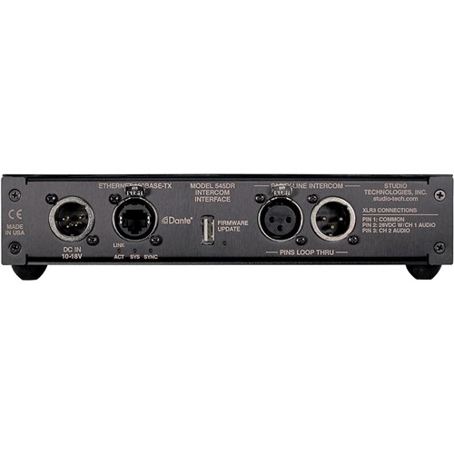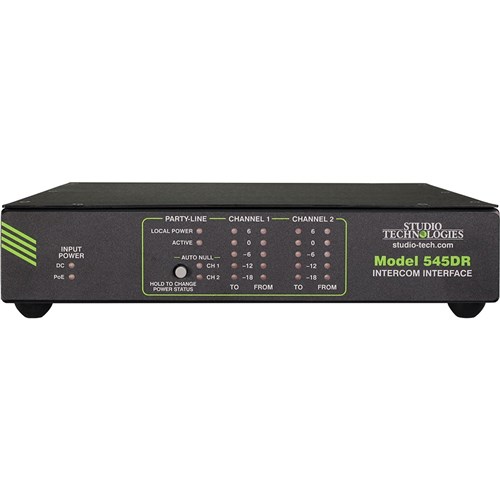 The Model 545DR is designed for applications that utilize 2-channel party-line (PL) intercom circuits. Dante audio-over-Ethernet media networking technology is used to transport the two send and two receive audio channels. Two Model 545DR units can interconnect by way of an Ethernet network. Alternately, a Model 545DR can interconnect with other devices such as matrix intercom systems, DSP processors, and audio consoles. Party-line power and termination can be supplied by the Model 545DR, allowing direct connection of user beltpacks such as the RTS® BP325. Housed in a lightweight tabletop enclosure with optional mounting kits. Power-over-Ethernet (PoE) powered.