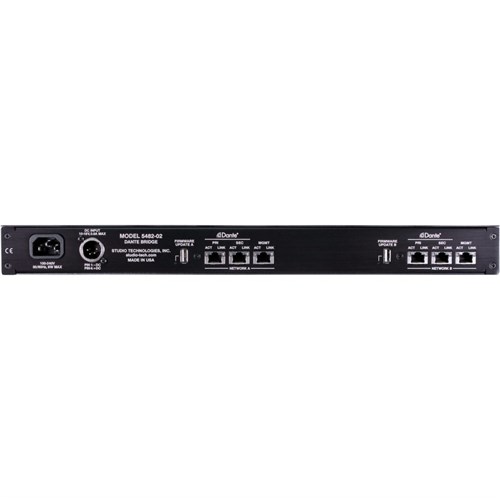 The Model 5482 Dante Bridge provides a high-performance means of interconnecting ("bridging") Dante audio-over-Ethernet channels associated with two independent local-area-networks (LANs) or Dante domains. The unit is compatible with the Dante Domain Manager™ (DDM) software application and is complaint with the AES67 technical standard. The Model 5482 is available in two versions: the Model 5482-01 allows up to 32 audio channels to pass in each direction, while the Model 5482-02 allows up to 64 audio channels.