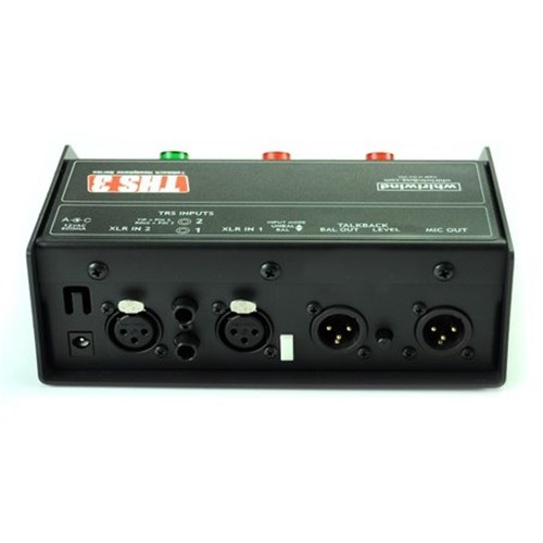 The THS 3 has both main and talkback microphone outputs. A latching Mic On/Off switch connects signal to the main mic output. The switch is illuminated red when the mic output is live. Two types of onboard condenser microphone power are available, enabling seamless switching when talkback is activated. A three way switch selects either phantom or "T" power and is recessed to avoid accidental turn off. A momentary Cough switch silences both the mic out and the talkback out when depressed. The momentary Talkback switch connects audio to the talkback output and mutes the mic out. The announcer’s microphone is sent through a preamp and line driver that deliver signal to the talkback output at line level. There is a level control for fine adjustment of the audio sent down the talkback line. The Talkback switch illuminates green when depressed.