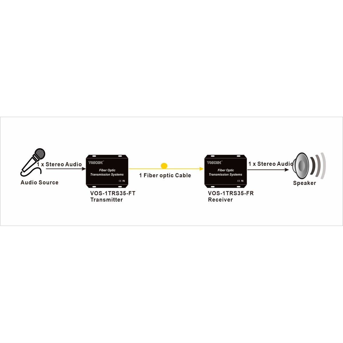 VOSCOM Stereo Audio over Fiber Converter, VOS-1TRS35-FT/R transmits 1-channel simplex Stereo audio over fiber. using 24-bit digital encoding, ensuring clear sound and reliable long-distance signal delivery. Perfect for broadcast studios, CCTV systems, and professional AV setups, it offers high-quality audio with strong resistance to interference.Stand-alone or rack-mount. This audio optical converters can work as a standalone unit for simple setups or as an insert card for rack mounting. The card fits into our 14-slot, 19-inch 2U (VOS-CH02) or 4U (VOS-CH04) rack-mountable frames, making it easy to manage multiple units in control rooms. The modular design supports easy expansion and maintenance while saving space.